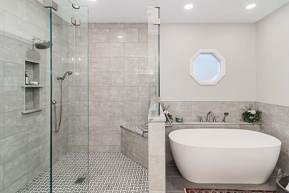 The master bathroom was transformed from a cave-like space with a dated tub into a serene spa retreat. Frameless glass shower doors, a new free-standing tub, and high-end cabinetry paired with stone countertops and beautiful tile work created a space that feels light, open, and indulgent — a true escape.